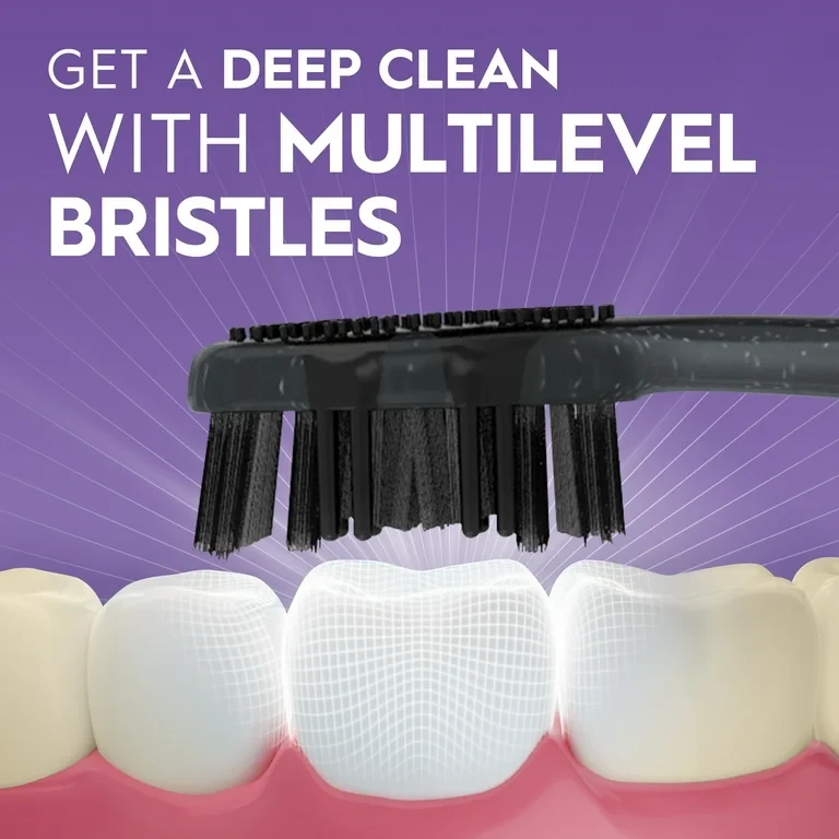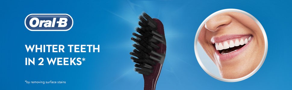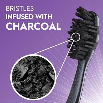 The Oral-B Charcoal toothbrush features charcoal infused bristles! It whitens teeth by removing surface stains. PowerTip bristles help clean plaque in hard to reach places while Gum Massagers gently massage your gums and help clean along the gumline. Additionally, the Tongue and Cheek Cleaner work to gently clean your tongue and cheeks. Whitens teeth by removing surface stains. Dentists recommend changing your brush every 3 months. A new toothbrush can remove up to 30% more plaque than one 3 months old.** Trust the brand more dentists use themselves worldwide, Oral-B. **Research with a flat trim manual toothbrush